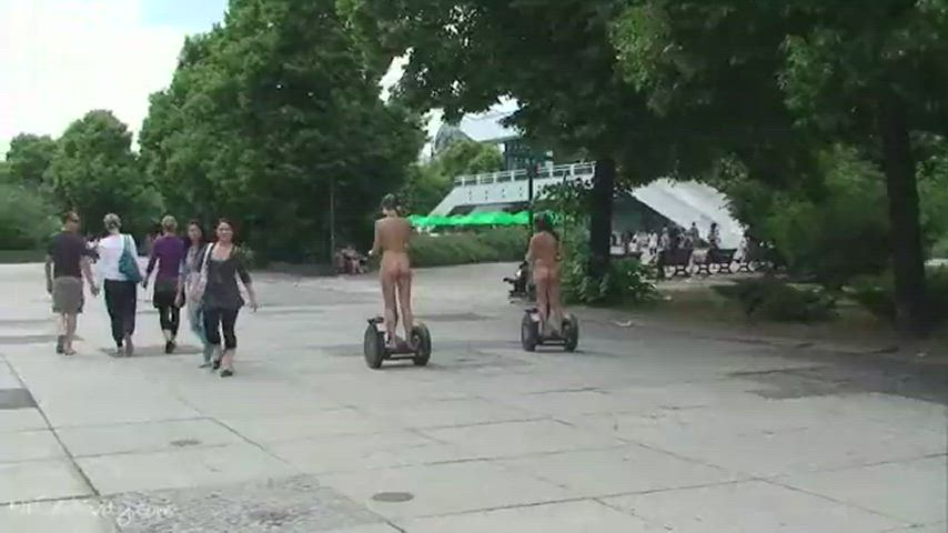 Two Girls Walk Naked Down The Street Riding A Skateboard