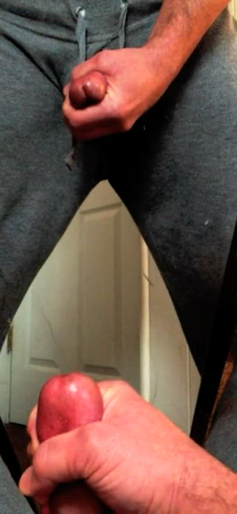 Unloading my full sack of sperm on a mirror while the wife is upstairs.