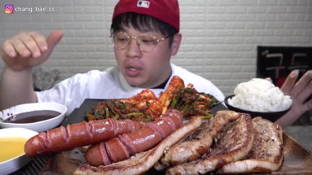 창배_통칼집삼겹살 파김치 마늘소스 조합 먹방-2