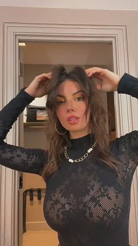 babe big tits booty brown eyes brunette clothed leather lipstick white girl gif